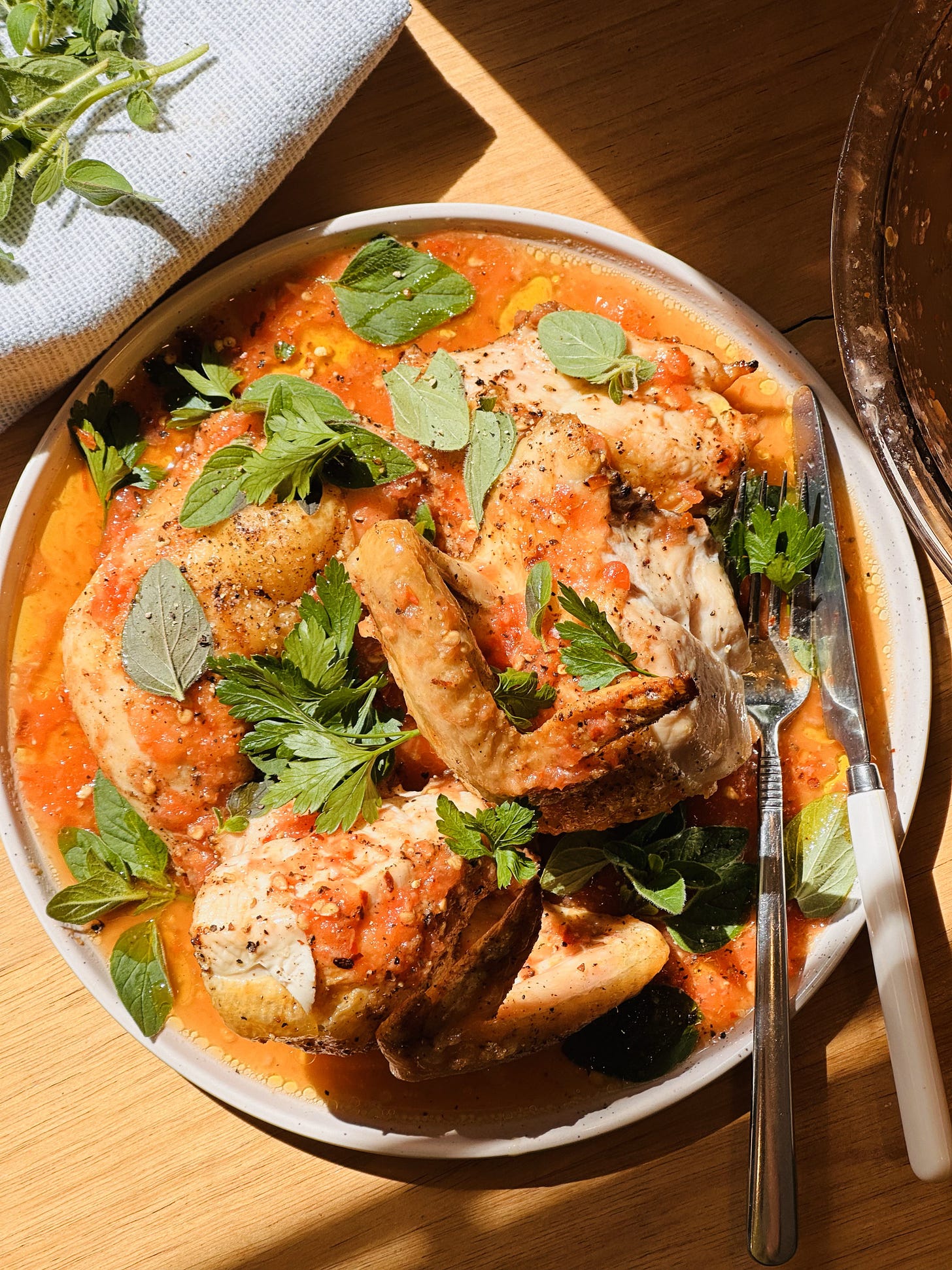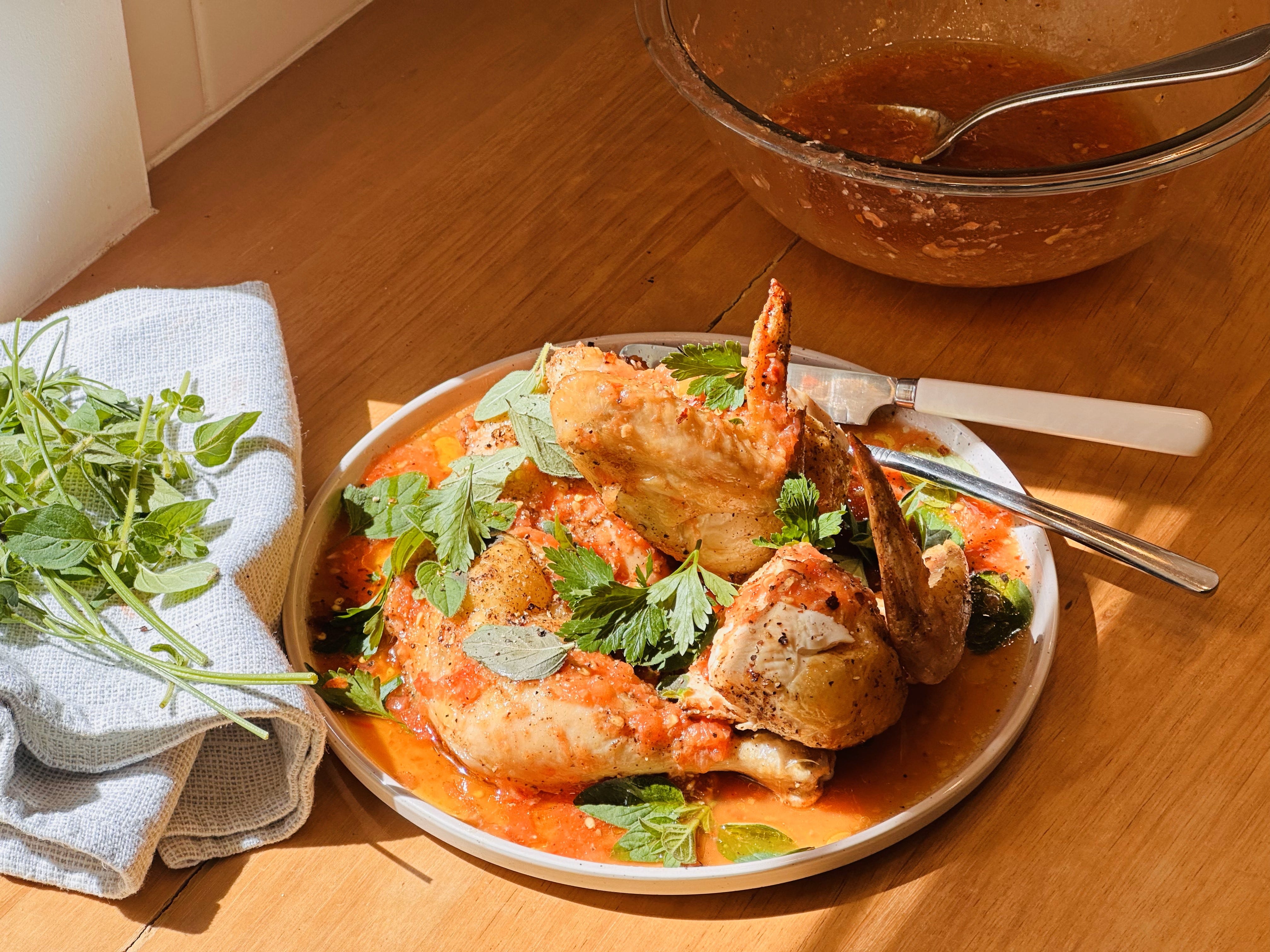 This recipe, is for the time where you are willing to do just enough because you are almost doing too much. Aggressively pulverizing tomatoes on a box grater to get a acidic pulp, to be dressed with roasted chicken juices. That’s it. I constantly am thinking am I doing enough to this recipe, am I not doing enough? But the most important thing - if it tastes good, eat it. It doesn’t need to be complicated, it doesn’t need ingredients from any specialty stores, and sometimes it includes some pretty terrible early season tomatoes.